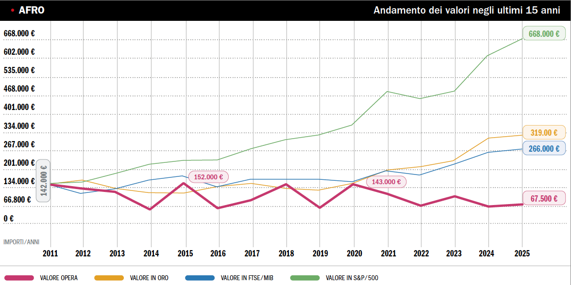 Afro (1912-76) ha perduto gran parte del tesoretto. La sua stella ha brillato luminosa per almeno 10 anni, dal 2005 al 2015, per poi perdere d’intensità. Basti pensare che già il 16 ottobre 2006 da Sotheby’s a Londra «Golfo degli aranci» (115x147 cm), un’opera di notevole intensità datata 1957, aveva raggiunto 467mila sterline, pari a 693mila euro, trovando il consenso dei collezionisti stranieri, in particolare di quelli inglesi. Dalla fine degli anni Novanta del secolo scorso alla metà degli anni Dieci i prezzi di Afro sono raddoppiati per poi iniziare un lento declino, tanto che oggi i valori sono inferiori del 52% rispetto al 2011 e appaiono certamente appetibili per i collezionisti che vogliono muoversi controcorrente. Nel 2025 una sola opera ha superato i 100mila euro e non è certo un capolavoro della maturità, bensì una testimonianza del 1952, quando Afro compariva tra i protagonisti del Gruppo degli Otto. Si tratta di «Ritmi fermi» di 110x70 cm, venduta per 108mila euro nell’asta milanese di Sotheby’s del 28 maggio 2025. Tra le opere degli anni Sessanta, sempre da Sotheby’s a Milano, il 26 novembre 2025 «Il pendolo» del 1962, tecnica mista di 39x55 cm ha fatto fermare il martello del banditore a 76mila euro. A quanto pare i tempi d’oro sono lontani.