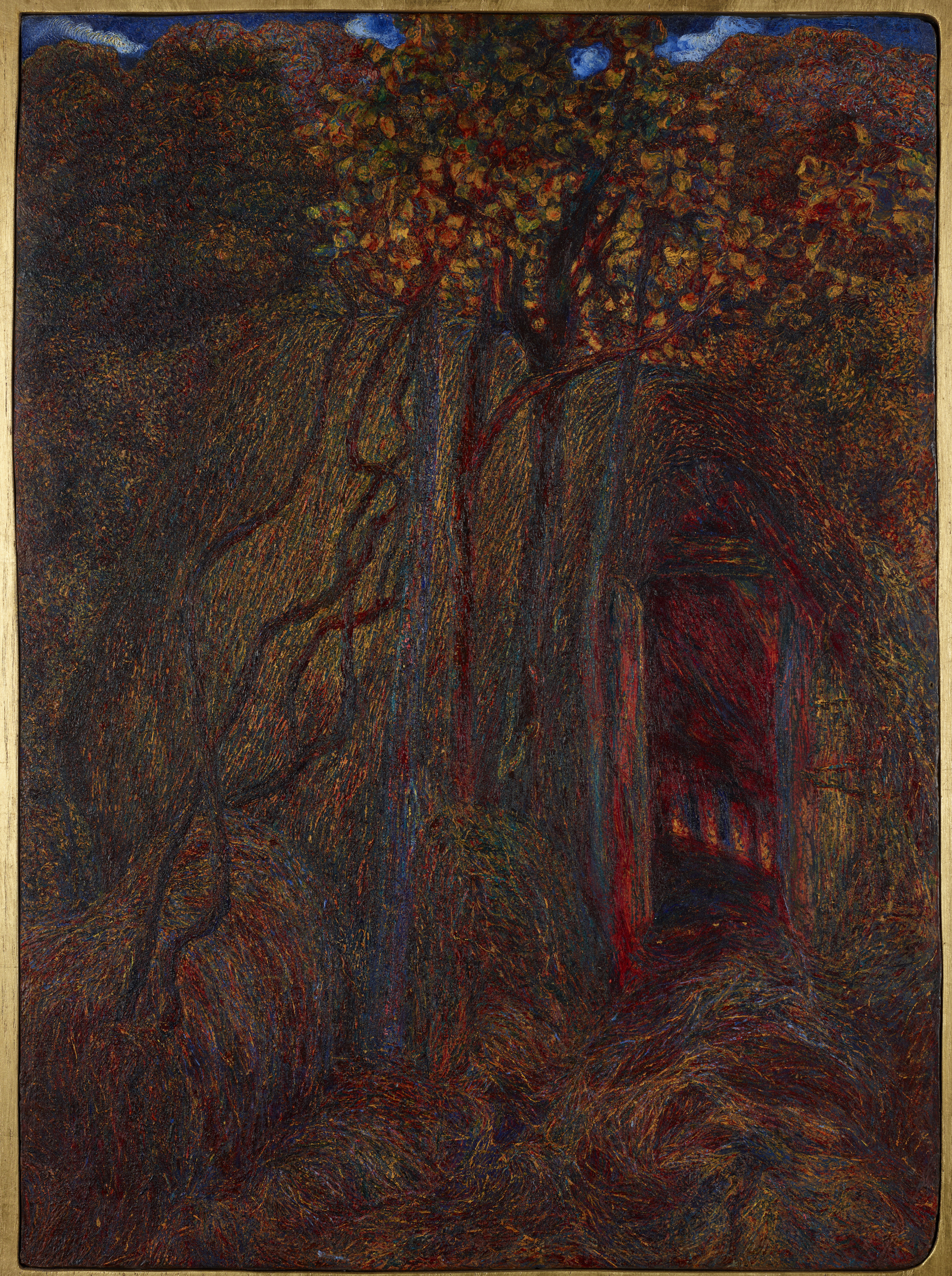 Nel primo è rappresentata una natura rigogliosa e vibrante, composta da pennellate di colore dense e pastose, disposte sulla tela in modo emozionale, seguendo andamenti modulati e curvilinei: tutti elementi che preannunciano il raggiungimento da parte dell’artista lombardo (Madesimo, Sondrio, 1872- Santa Margherita Ligure, Genova, 1922) di una autonomia espressiva, fino ad arrivare al periodo in cui si dedicherà al paesaggio costiero ligure.