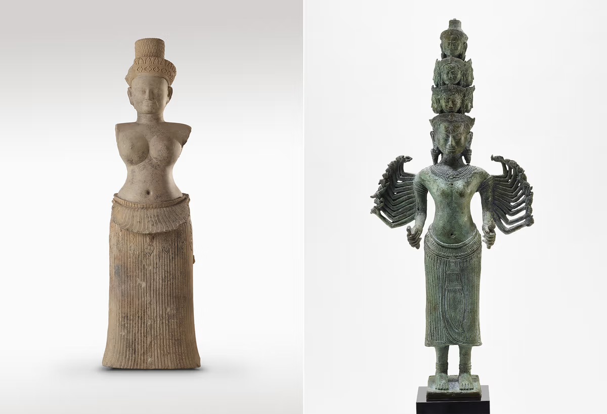 I manufatti restituiti comprendono una testa in arenaria del X secolo raffigurante Harihara, divinità sincretica che unisce Shiva e Vishnu, riconducibile stilisticamente al tempio di Pre Rup; una scultura in arenaria alta circa 1,20 metri raffigurante la dea Uma, anch’essa del X secolo e collegata al complesso di Phnom Bakheng; e una statua in bronzo di Prajnaparamita, dea della saggezza trascendentale, databile intorno al 1200.