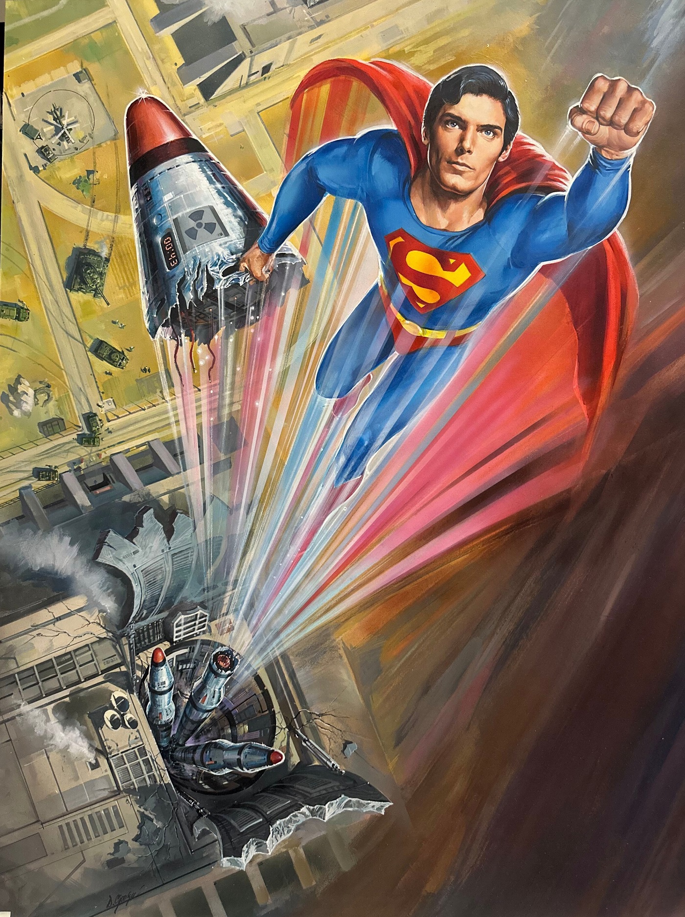 A Washington D.C., la settimana del supereroe è stato il momento scelto dal National Museum of American History, uno dei musei della galassia Smithsonian, per annunciare l’acquisizione di un dipinto originale di Dan Goozée, pittore commerciale scomparso nel 2024 a 81 anni, noto soprattutto per i suoi lavori per aziende dello spettacolo e dell’intrattenimento. Il dipinto ora nel museo di Washington raffigura Superman mentre vola con il pugno alzato attraverso un silo missilistico nucleare in una base militare, con alle sue spalle un’arma nucleare disinnescata e distrutta, proprio quando mancano pochi secondi alla sua esplosione: l’opera fu utilizzata per la realizzazione di materiale promozionale, tra cui i manifesti del film «Superman IV: The Quest for Peace» (del 1987), scritto da Lawrence Konner e Mark Rosenthal su una storia di Christopher Reeve (che interpretava anche il supereroe), Konner e Rosenthal, diretto da Sidney J. Furie e distribuito dalla Warner Bros. Il film non ebbe successo al botteghino e anche i critici non furono benevoli, ma ha una storia interessante, soprattutto per i temi, in primis le armi nucleari e la pace mondiale, intorno a cui è costruita la trama. Fu lo stesso Reeve a proporli (subordinando la sua partecipazione al film alla loro accettazione), in segno di protesta contro il fallimento del vertice tra Usa e Urss sul tema del disarmo tenutosi a Reykjavik, in Islanda, nel 1986, contro la politica dell’allora presidente degli Stati Uniti Ronald Reagan e il suo scetticismo nei confronti del controllo degli armamenti. Superman, nella trama, si rivolge alle Nazioni Unite e annuncia il suo piano per liberare il mondo da tutte le armi nucleari, ma viene messo alla prova quando il suo nemico Lex Luthor lo induce a creare un rivale dotato di superpoteri, Nuclear Man.