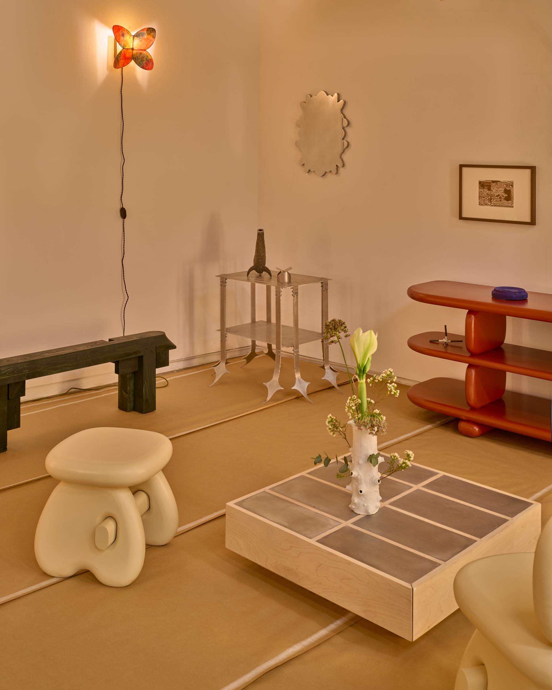 L’articolazione della fiera si sviluppa attraverso diverse sezioni tematiche che riflettono le principali linee di ricerca del settore. Al centro si trova MAIN, che riunisce una selezione di gallerie consolidate impegnate nel dialogo tra design, architettura e arti visive. Tra i debutti di quest’anno figurano kammer, Objekt Gallery, VAN OOSTEROOM GALLERY, Galerie Liberté e Second Nature Gallery, affiancate da realtà già note al pubblico della fiera come Cour, Gusch, Uppercut, Maniera, VASTO Gallery e Spazio Viruly. Proprio Maniera presenta un solo show della designer francese Anouck Morlon, con nuove opere tra cui la seduta Ravioli One Seater e il tessile Blanket, mentre la galleria belga Cour sceglie una scenografia radicalmente diversa dai suoi precedenti allestimenti minimalisti, costruendo uno spazio vibrante dominato da carte da parati e tonalità terrose. Gusch, invece, mette in scena un ambiente immersivo in cui mobili brutalisti in legno scolpito dialogano con tessuti saturi di colore e riferimenti all’estetica antroposofica.