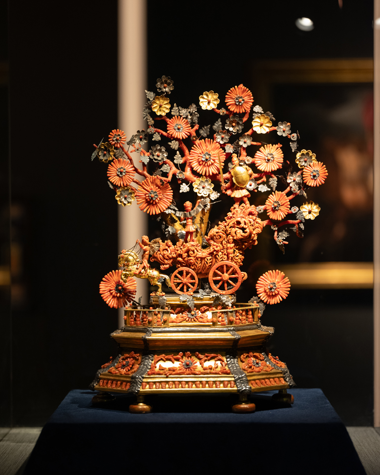 Proprio all’interno del fervente spirito religioso che animava l’aristocrazia siciliana, come è stato notato [6], questo genere di monumentali composizioni furono eseguite per diffondere, secondo i dettami della propaganda controriformista, le figure di particolari santi: nel nostro caso San Michele Arcangelo che, come comandante degli eserciti celesti, era considerato il simbolo della lotta della Chiesa cattolica contro gli eretici. Anche la scelta di inserire alle spalle del carro lo scenografico albero fiorito potrebbe alludere ad una rinnovata rinascita delle fede che, grazie all’intervento divino, si rigenera e rinvigorisce come in primavera la natura risorge in tutta la sua bellezza di fiori e foglie. L’opera, in virtù della sua elaborata e monumentale struttura, può essere inscritta tra quei maestosi lavori in corallo destinati ad abbellire le dimore di principi e sovrani come la famosa «Montagna di corallo» acquistata nel 1570 a Trapani per conto del vicerè di Sicilia, don Francesco Ferdinando d’Avalos, che la inviò in dono a Filippo II di Spagna; o la più tarda, stupefacente composizione dedicata a Santa Rosalia mandata nel 1631 dal Senato di Palermo in dono a papa Urbano VIII. Si aggiunga infine che durante il Seicento, e per alcuni decenni del secolo successivo, i maestri corallari per tali importanti lavori facevano spesso uso, come si può vedere anche nel nostro trionfo, di grandi rami di corallo al naturale assai preziosi per la loro rarità e perciò destinati a suscitare la meraviglia nei fortunati destinatari [7]. Questo ricercato trionfo, con la sua sfarzosa ornamentazione in corallo tipica delle maestranze trapanesi attive tra sei e Settecento, si pone dunque all’interno di quel vivace clima culturale di derivazione barocca che investì l’isola a partire dalla fine del XVII secolo, un’epoca di felice congiuntura artistica e culturale tra Palermo e Trapani che generò opere di straordinaria raffinatezza e di cui il nostro arredo è un’eccelsa testimonianza.