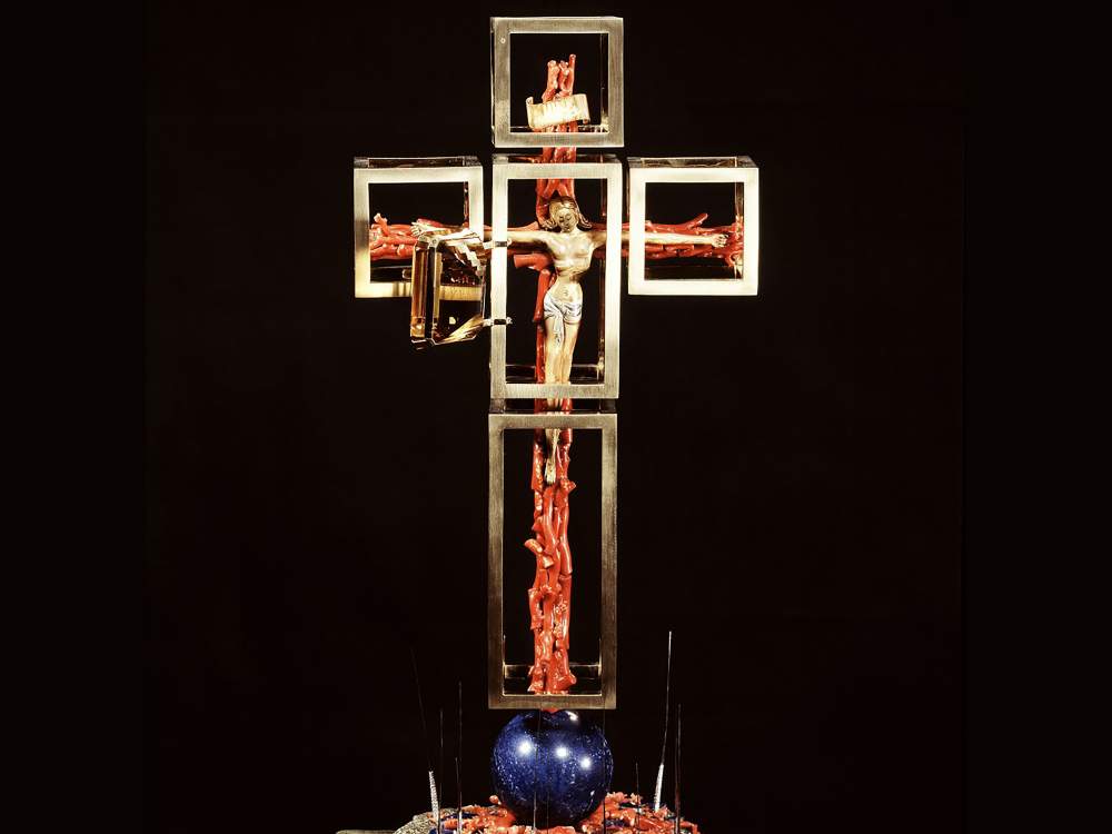 Realizzata nel 1960 in oro, ambra, citrino, diamanti, platino, corallo, topazio, lapislazzuli e pirite-marcasite (solfuro di ferro), la croce è alta 70 centimetri. I conservatori avevano notato la disgregazione di una parte della base dovuta ad aumento dell’umidità e proliferazione batterica.