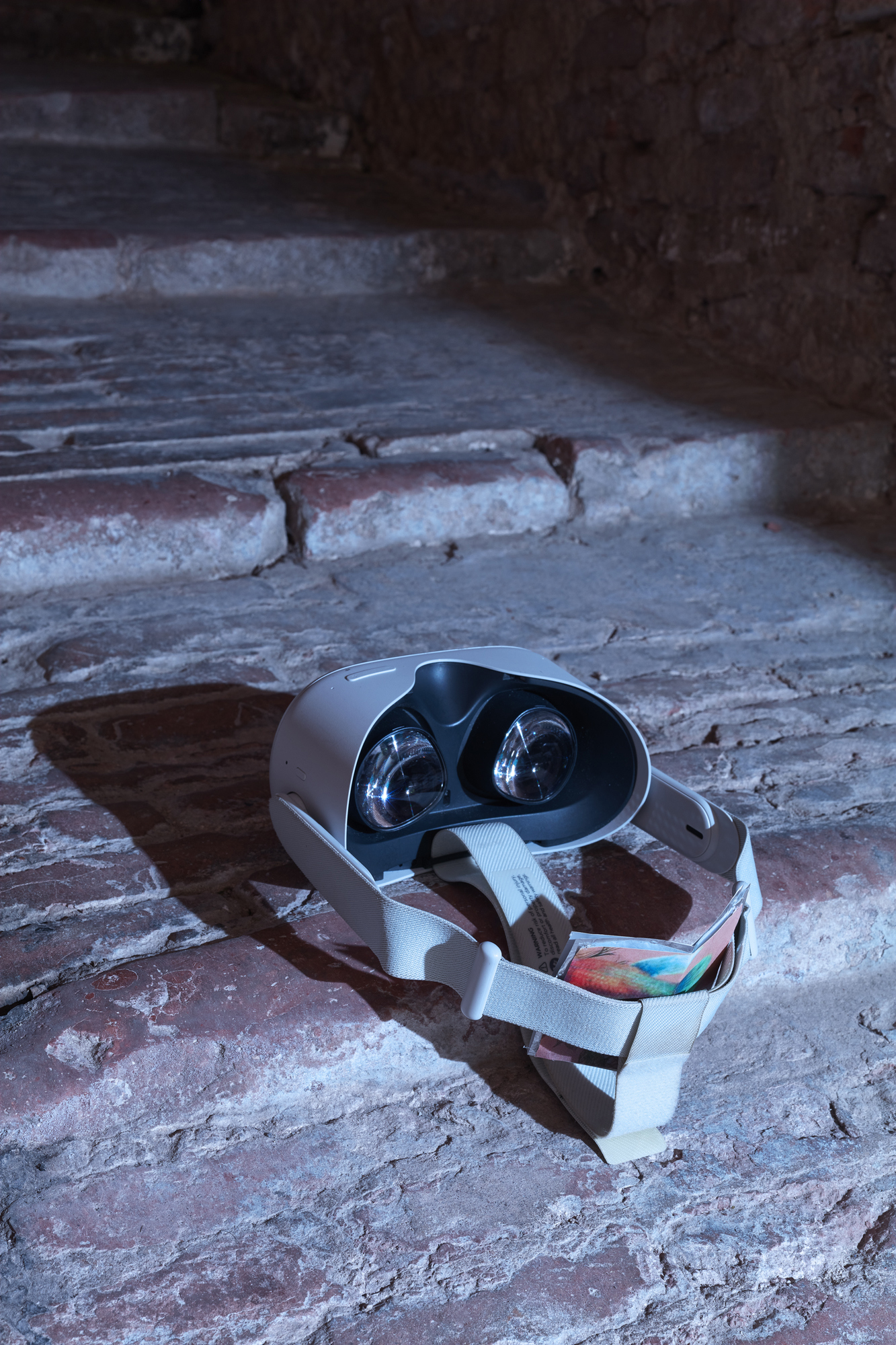 La prima coppia che incontriamo sono due visori per la Realtà Virtuale. Il titolo («untitled»; tutte le opere sono del 2026) non aiuta, e i materiali ancora meno: «visori VR, pesce d’acquario, carta da regalo». Ma, osservandoli, notiamo che sono disposti e illuminati in modo che la cinghia che serve per fissarli alla testa sembri un paio di braccia che reggono un piccolo libro fatto di carta riflettente, con stampata «in copertina» la fotografia di un pesce rosso. Le due lenti sembrano un paio di occhi, e così il visore diventa una figura antropomorfa che legge. Di fronte troviamo «chmucke dich, o liebe seele, bwv 654», un catino pieno di gavettoni. Il titolo dell’opera viene da quello di un corale di Johann Sebastian Bach («adornati, o anima cara»), solitamente suonato durante le Comunioni nella Chiesa luterana e ispirato all’Eucaristia nel Vangelo di Matteo, la consacrazione del pane e del vino che diventano corpo e sangue, simbolo al contempo di separazione fisica e unione spirituale. L’acqua nei palloncini è separata in tante piccole bolle, che a loro volta sono separate dai pesci, così come i visori sono strumenti per una visione personale, separata, a formare tante piccole «bolle» sociali nell’ambiente digitale.