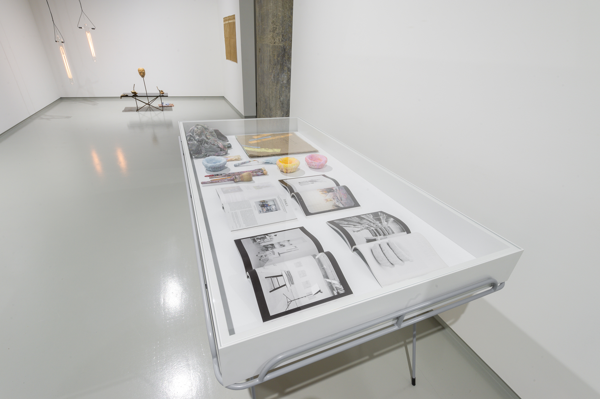 Nel 2018, l’anno seguente al loro primo incontro, Starling visita lo studio di Griffa a Torino e realizza un report per Frieze. In una grande teca orizzontale troviamo copie della rivista che mostrano le fotografie scattate dall’artista all’atelier, e nella parete di fronte troviamo installate le stesse opere di Griffa che si intravedono in una delle immagini. Accanto alle pagine della rivista, una spatola per mischiare il colore, quattro pennelli e tre ciotole di plastica accresciute da centinaia di strati di pigmento: sono gli strumenti che Griffa usa quotidianamente da oltre trent’anni, e questa cura e rispetto nei confronti dei materiali ci fa comprendere come la sua pittura sia in fondo una costante ricerca di un approccio più consapevole nei confronti della vita, una lunga indagine su un possibile modo di stare al mondo che non gravi sugli altri e sull’ambiente. La portata di questo metodo viene evidenziata da una fotografia di Starling che ritrae uno scaffale su cui sono disposte basse pile di tele piegate: il magazzino in cui Griffa conserva le opere. Fin dagli esordi l’artista torinese non usa incorniciare i lavori, preferendo appenderli direttamente a parete con piccoli chiodi ai margini della tela, e l’immagine di Starling ci fa comprendere quanto sia concreta questa attitudine: un’intera personale dell’artista può essere movimentata con un’unica, piccola cassa.