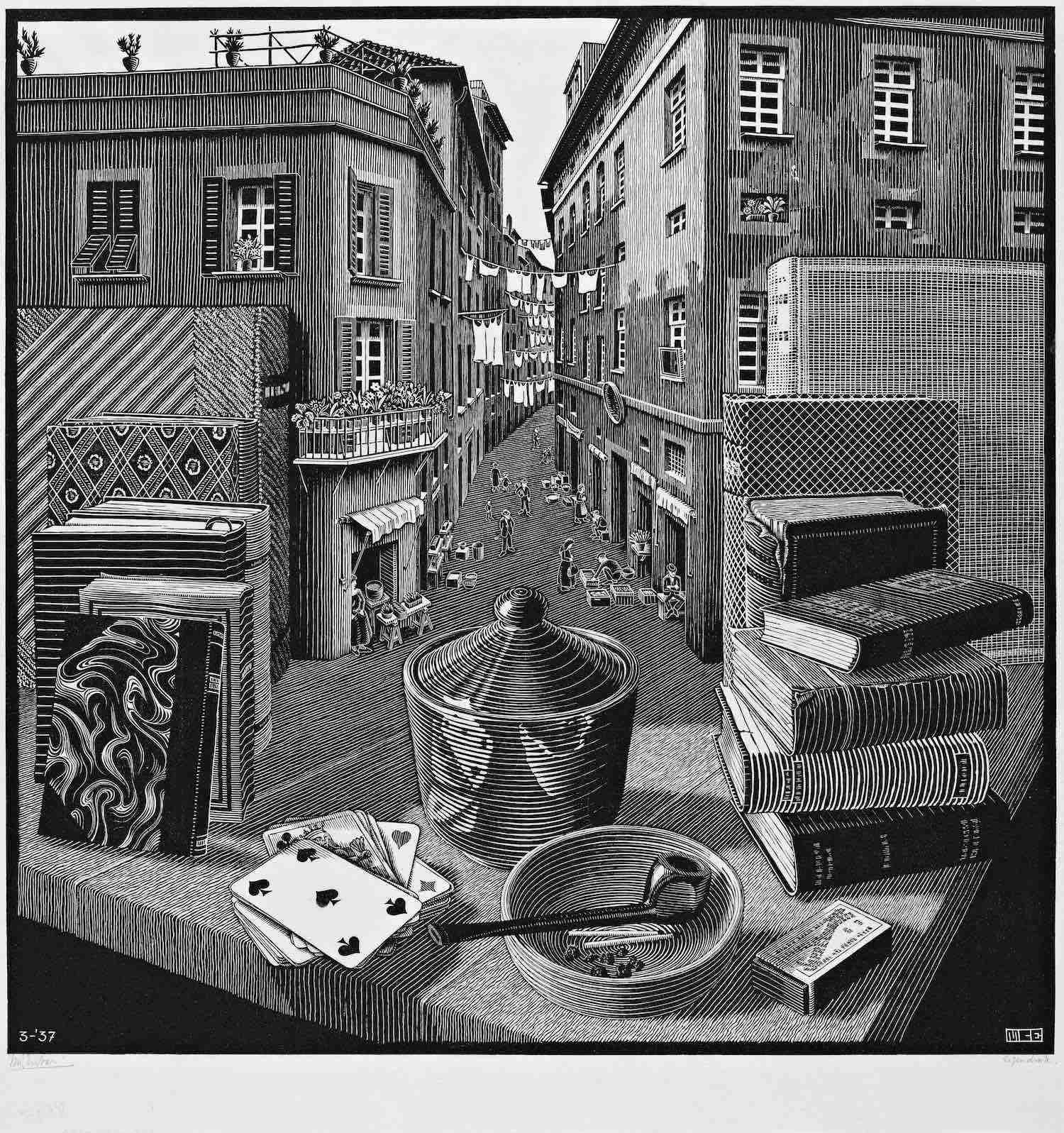 M.C. Escher, «Natura morta e strada», 1937. L’Aia, Kunstmuseum Den Haag. © 2025 The M.C. Escher Company. All rights reserved