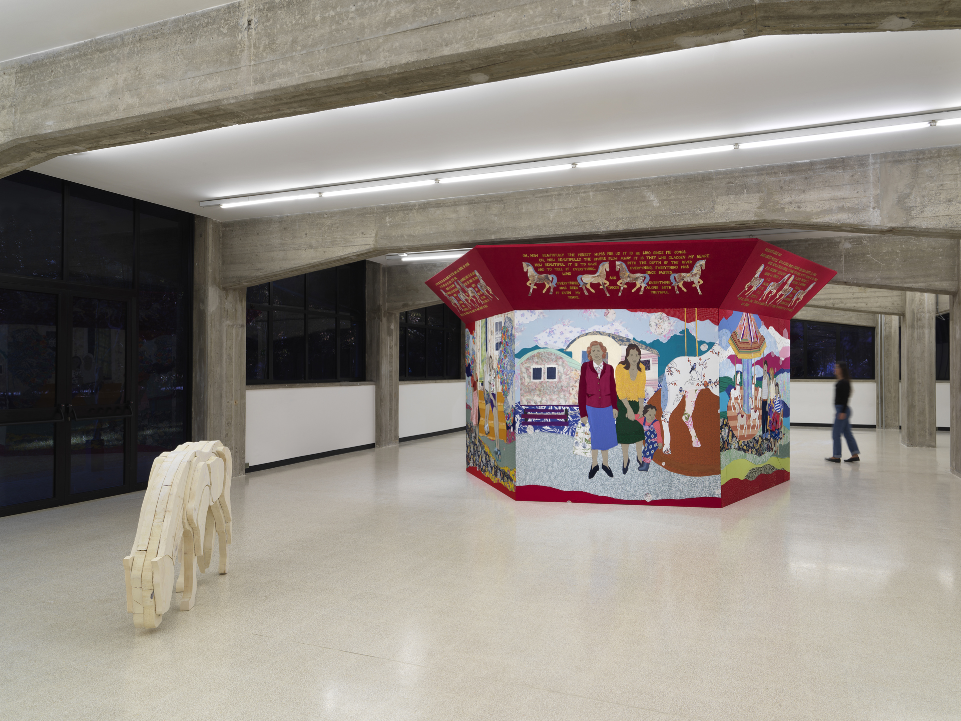 Al centro dell’allestimento reggiano campeggia una grande giostra ricoperta da stoffe multicolori, sulle quali l’artista ha cucito scene di vita quotidiana: famiglie riunite, bambini che giocano, donne che chiacchierano, uomini che aggiustano qualcosa o semplicemente si riposano. Non c’è retorica nella rappresentazione, né idealizzazione: è la vita stessa, quella che pulsa nei cortili, nei campi, nei caravan, quella che resiste, che si reinventa. Sulle fasce superiori dell’opera, come in un fregio antico, scorrono parole e versi, tra cui quelli della poetessa e cantante Papusza, figura leggendaria della cultura rom. È da un suo verso che Mirga-Tas prende il titolo della mostra: «Il Grande Carro predirà il futuro dei Rom».
