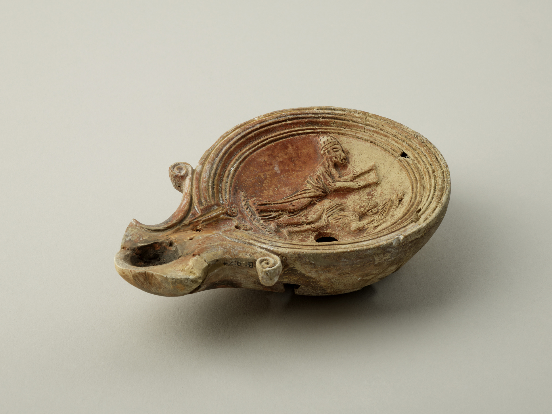 Lampada ad olio Epoca romana, I secolo a.C.-I secolo; civiltà: Roma antica; luogo di ritrovamento: Gaza, Blakhiyah. Proprietà dello Stato di Palestina, in deposito temporaneo al MAH-Musée d’art e d’histoire de la Ville de Genève. Foto Bettina Jacot-Descombes