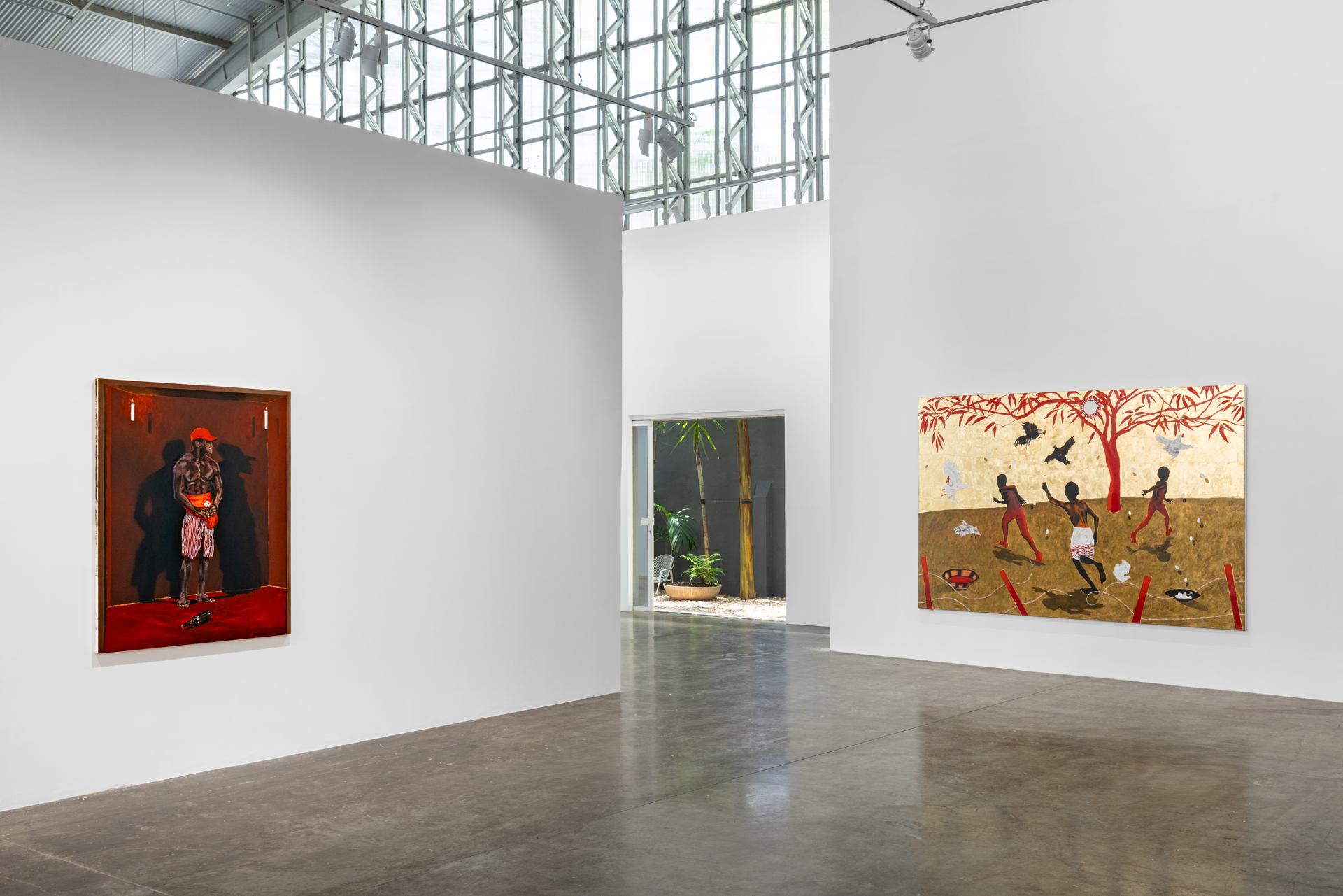 Un passo che sembra appartenere alla letteratura di Walter Hugo Mãe, uno degli autori portoghesi viventi più celebrati: «Cercavo di calmarmi, come a fermare il battito del proprio cuore. La mia natura era quella del movimento. Quasi sempre mi muovevo prima di sapere per dove o per che ragione. La mente non era mai più rapida che i nervi nel corpo. La mente aspettava ragioni e spiegazioni, il corpo seguiva la vertigine. Ero un animale attivato per la semplice evidenza di pulsare», scrive l’autore nelle vesti di Paulinho, nel romanzo Deus na escuridão. Nella grande installazione «Situação terreiro: acese», 2025, che occupa una intera area della galleria, uova rosse in cestini adagiati su terra battuta, soggetta alle modificazioni atmosferiche, alle cui sommità cala una pioggia di búzios (la conchiglia monetaria, utilizzata nei rituali di matrice africana e anticamente come valuta, ndr): «Tutti questi simboli si riferiscono a una memoria collettiva. Non sono vincolati a geografie né a epoche, nonostante si possa percepire un chiaro riferimento a certe tradizioni afro-brasiliane, come il gioco dei búzios. Però, anche in questo caso, l'uso del colore, il rosso, denota il momento di trasmutazione della materia. Anche in questo caso, i miei riferimenti junghiani giocano su un piano di coscienza e di trasformazione individuale. Questa porzione di terra, viva, è certamente destinata al culto, ma anche al lavoro. E tutto questo rosso, a cui la percezione deve abituarsi, emula profondità dinamiche, è quasi un pulsare. È quasi come entrare in un utero, in un ambiente che è vivo e non costante», spiega ancora l’autore brasiliano, che dichiara anche di lavorare attraverso un processo «misto».
