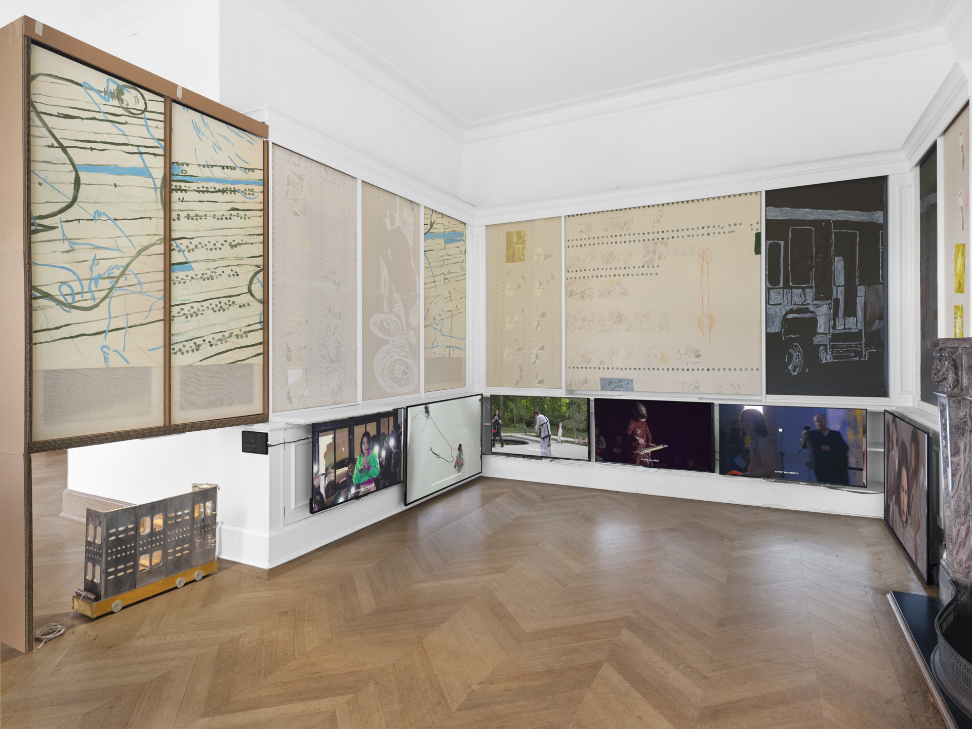 Le opere emergono così come reperti intercettati qua e là e il montaggio sostituisce la sequenza storica. Questo principio di discontinuità rispecchia l’impianto teorico della mostra che  procede a ritroso, collegando eventi apparentemente distanti, alcuni ormai remoti, risalenti addirittura al XIV secolo. Hannah Black, frammentando le rovine della sua opera «The Directions» (2022), costruisce una struttura che culmina nella rappresentazione di una carta astrologica di una rivolta. Il lavoro mette in relazione l’osservazione dei cicli stellari con la formazione dei sistemi cognitivi moderni, suggerendo che la ricerca di pattern, tanto in astronomia quanto nella storia, sia una strategia per dare senso a eventi altrimenti incomprensibili. Un diverso tipo di montaggio anima «The World Won’t Listen II» di Tony Cokes, installazione video multicanale che mette in risonanza le immagini televisive dei disordini di Los Angeles del 1992 con altri episodi di agitazioni globali. Ivan Cheng affronta la dimensione testimoniale con «Revolt Pleaser», una video-scultura che mette in scena brevi monologhi ispirati ad attacchi razziali e religiosi avvenuti sulle spiagge di Sydney. Con «TO WONG – Attributed to Paul Thek» (2017), Alessandro Di Pietro introduce invece una dimensione quasi archeologica: la scultura, composta da due scudi in bronzo che racchiudono una bobina cinematografica parzialmente visibile, funziona come una capsula del tempo il cui contenuto resta deliberatamente indecifrabile. L’allusione possibile a figure contemporanee come Joshua Wong convive con un sistema di attribuzioni instabili che confonde i confini tra storia dell’arte, documento e finzione. «GDPCN» di Satoshi Fujiwara sposta l’attenzione sulla dimensione quotidiana che precede ogni insurrezione. Le fotografie scattate a Wuhan nel 2024, stampate su pannelli industriali e sospese al soffitto, recano segni bianchi spettrali che evocano l’iconografia della Ribellione dei Turbanti Rossi, rivolta che avvenne in Cina nel XIV secolo contro la dinastia Yuan, creando un corto circuito visivo tra presente e passato. Hannah Quinlan e Rosie Hastings affrontano invece la dimensione monumentale con un nuovo affresco sulla rivolta della Compton’s Cafeteria a San Francisco del 1966 contro le vessazioni della polizia nei confronti delle persone transgender. Le sculture video di Tiffany Sia, «Scroll Figures», interrogano il ruolo dei media come strumenti di contro-insurrezione. Utilizzando estratti di trasmissioni delle reti televisive di Berlusconi, le sue opere sovrappongono testi a scorrimento verticale a filmati che scorrono lateralmente, combinando la forma premoderna del rotolo con il linguaggio televisivo contemporaneo. Infine, Sung Tieu presenta un nuovo lavoro della serie «Read Me, Wear Me, Fear Me»: abiti di cotone composti da articoli di giornale che documentano gli attacchi di estrema destra contro immigrati a Hoyerswerda e Rostock tra il 1991 e il 1992. L’opera mette in relazione la violenza razziale con l’industria tessile e le condizioni di lavoro dei migranti, trasformando il corpo vestito in un registro di informazioni e traumi.