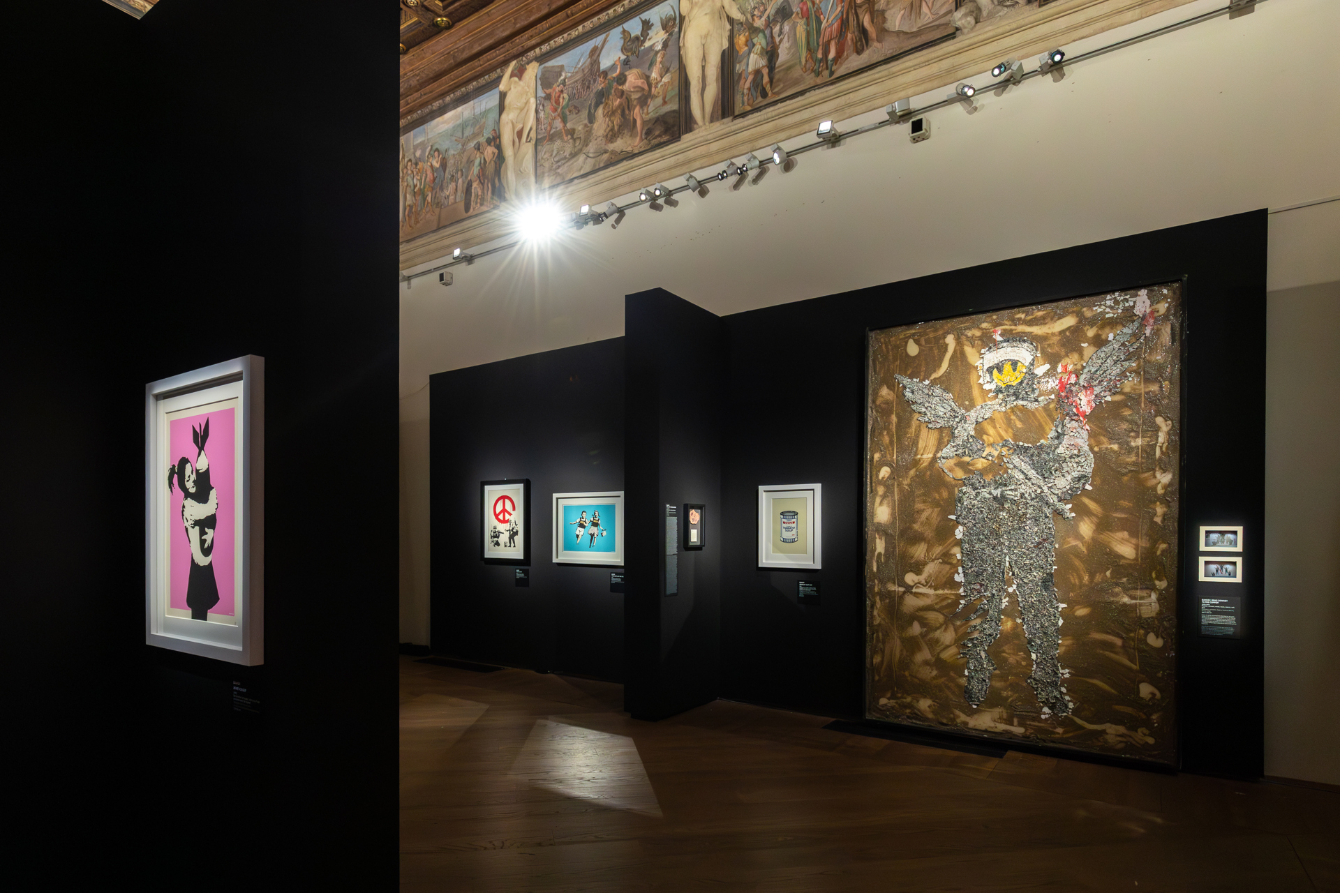La premessa curatoriale postula l’esistenza di una Scuola di Bristol, i cui protagonisti sono tanto gli artisti quanto le figure culturali che hanno aperto la strada percorsa da Banksy, che hanno conosciuto e collaborato con l’ex anonimo artista britannico. Sono loro i cocuratori di questa mostra. La Scuola di Bristol da cui proviene Banksy è un campo dinamico di relazioni tra storia urbana, dissenso politico, culture musicali e sperimentazioni visive. Bristol, con la sua memoria coloniale e la sua tradizione di protesta, non costituisce un semplice sfondo, ma una matrice attiva con tratti molto specifici, in cui si sviluppa una peculiare scena dei graffiti degli anni Ottanta e Novante del ’900: un laboratorio collettivo in cui la città diventa la superficie di affermazione identitaria e di costruzione narrativa in cui affonda le radici il linguaggio di Banksy. Figure come John Nation, le sperimentazioni pionieristiche di Robert Del Naja (3D), Ian Dark (Z-Boys),Tom Bingle (Inkie), Felix Braun (FLX), Kye Thomas (Soker/Sokem), Jody Thomas, tra gli altri, definiscono un lessico che precede e prepara le successive sintesi a stencil di Banksy. Attraverso opere, materiali d’archivio, documenti inediti e studi accademici indipendenti, la mostra inserisce Banksy in una storia corale e il suo immaginario in una genealogia condivisa.