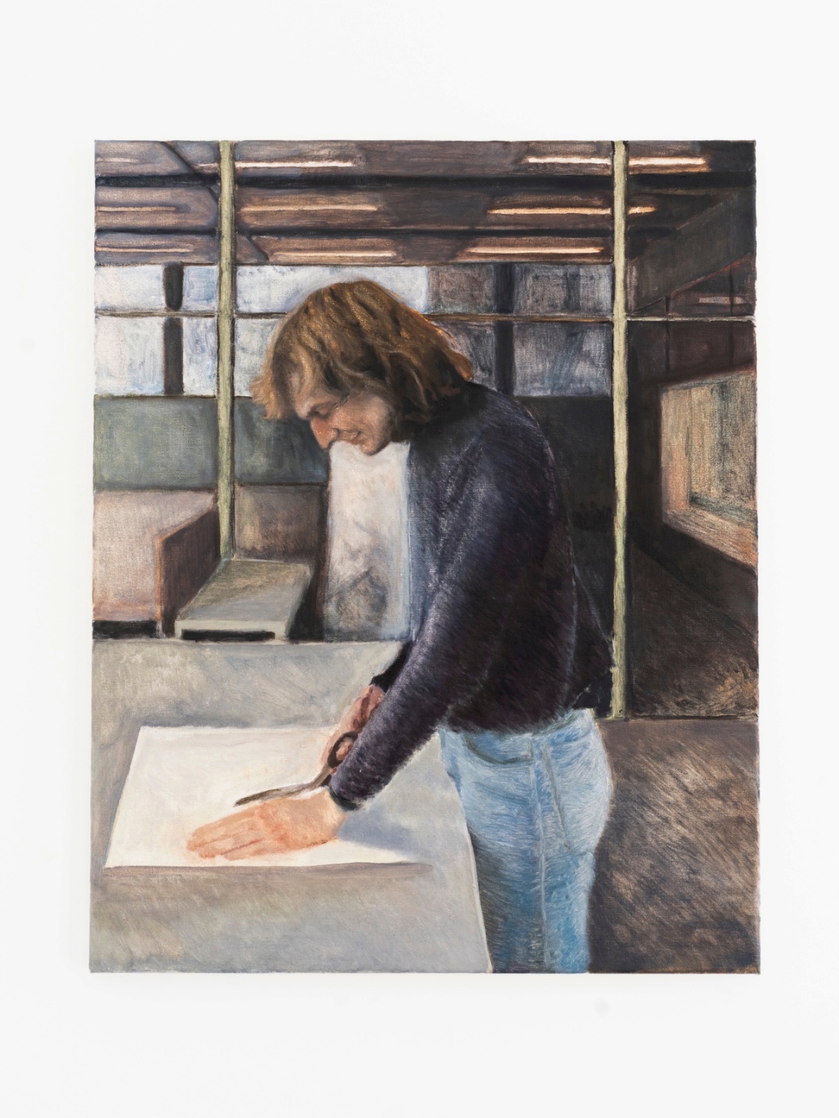 Melle Van Herwaarden Coupeur 3 (Gijs) 2025, oil on linen, 75 x 60 cm / 29.5 × 23.6 in - Courtesy of the artist, CFA and velo project, Milan