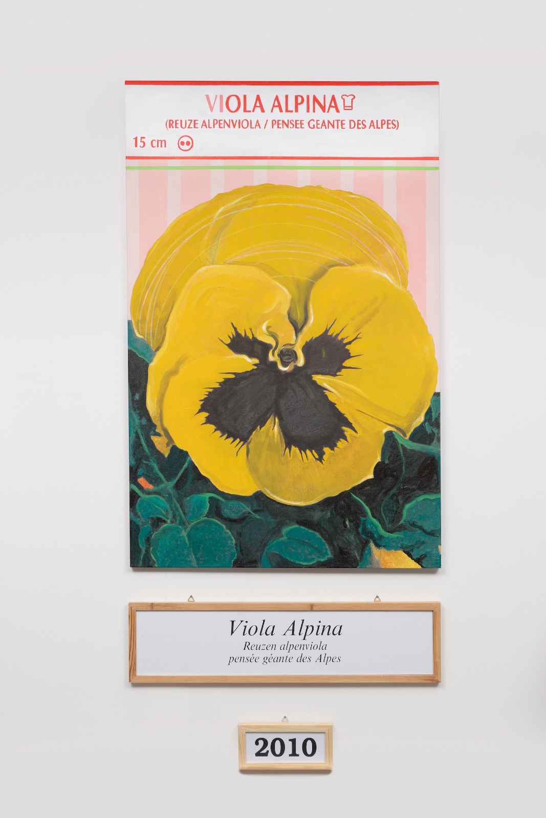 Jef Geys Viola Alpina (Reuze Alpenviola / Pensée géante des Alpes) 2010, oil on canvas and two frames (one painting each year) 140 x 90 cm, 23 x 90 cm, 13 x 27 cm / 55 x 35.4 in, 9 x 35.4 in, 5 x 10.6 in - Courtesy of the artist and Air de Paris, Paris