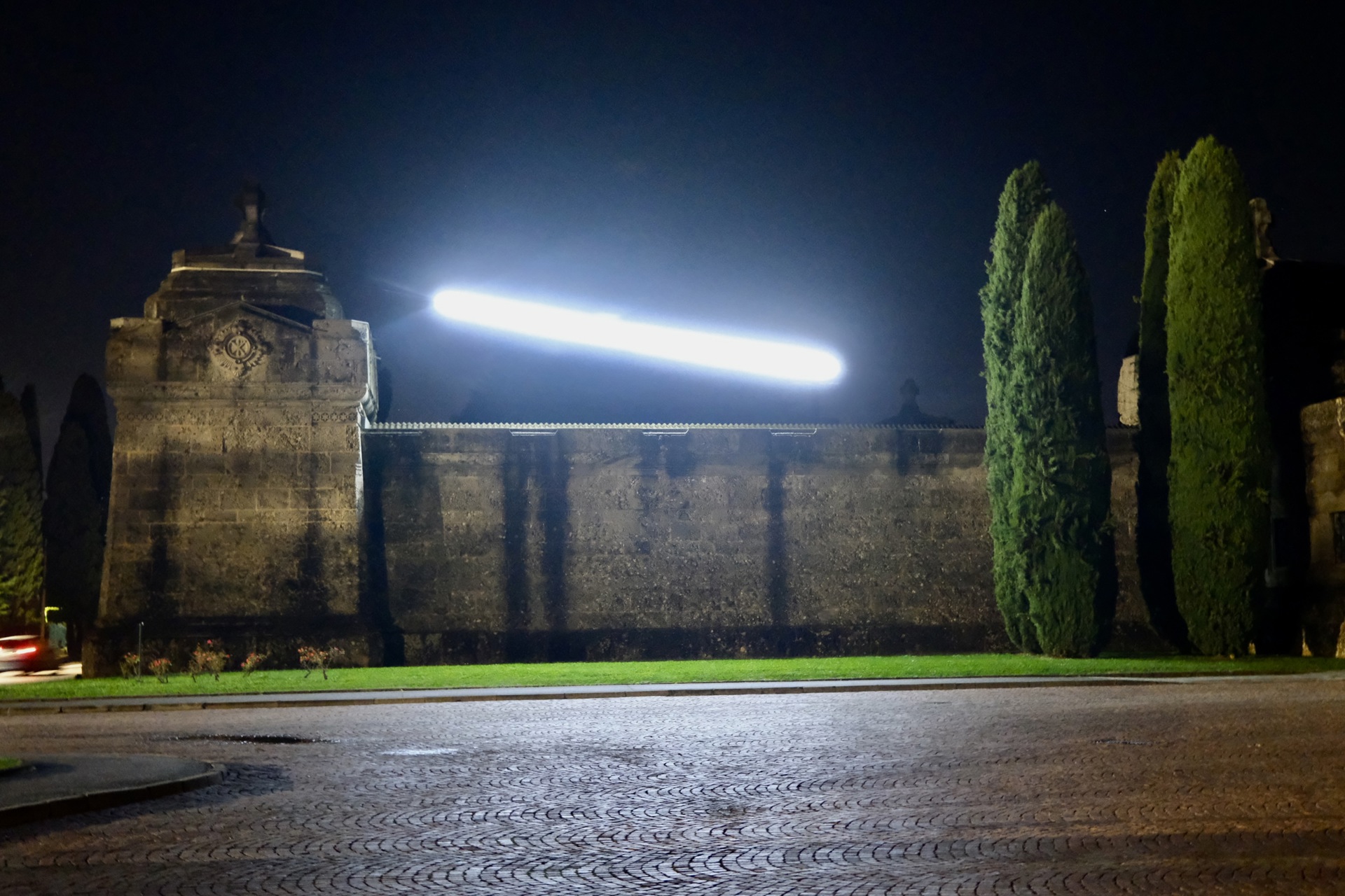 Questa visione profondamente duplice costituisce la radice poetica della mostra. Memoria e ricordo non sono soltanto atti individuali, ma anche collettivi: a ricordare siamo noi, la comunità dei rimasti, coloro che abitano l’oggi e che, nel ricordare, tengono accesa la vita. Le opere concepite per il Cimitero Monumentale diventano la traduzione artistica di questo spazio liminale: entrambe le installazioni realizzate per Contemporary Locus 17 si pongono come ponti, come passaggi tra ciò che è stato e ciò che ancora può essere. Con «Shooting Stars», il duo artistico Antonello Ghezzi, composto da Nadia Antonello e Paolo Ghezzi, disegna una linea luminosa che attraversa la facciata sinistra del cimitero come una stella cadente. Il sistema, collegato in tempo reale al radiotelescopio Croce del Nord dell’Istituto Italiano di Astrofisica, si accende ogni volta che una meteora attraversa il cielo del Mediterraneo, in media una al minuto. Ogni 60 secondi, dunque, chi passa davanti al cimitero vede una luce accendersi, una cometa tradotta in segnale terrestre, un ponte tra chi siamo stati, chi siamo ora, e chi non c’è più. C’è, in questa pulsazione luminosa, la stessa ingenua e tenace speranza del desiderare, il gesto più vitale e universale che ci resta.