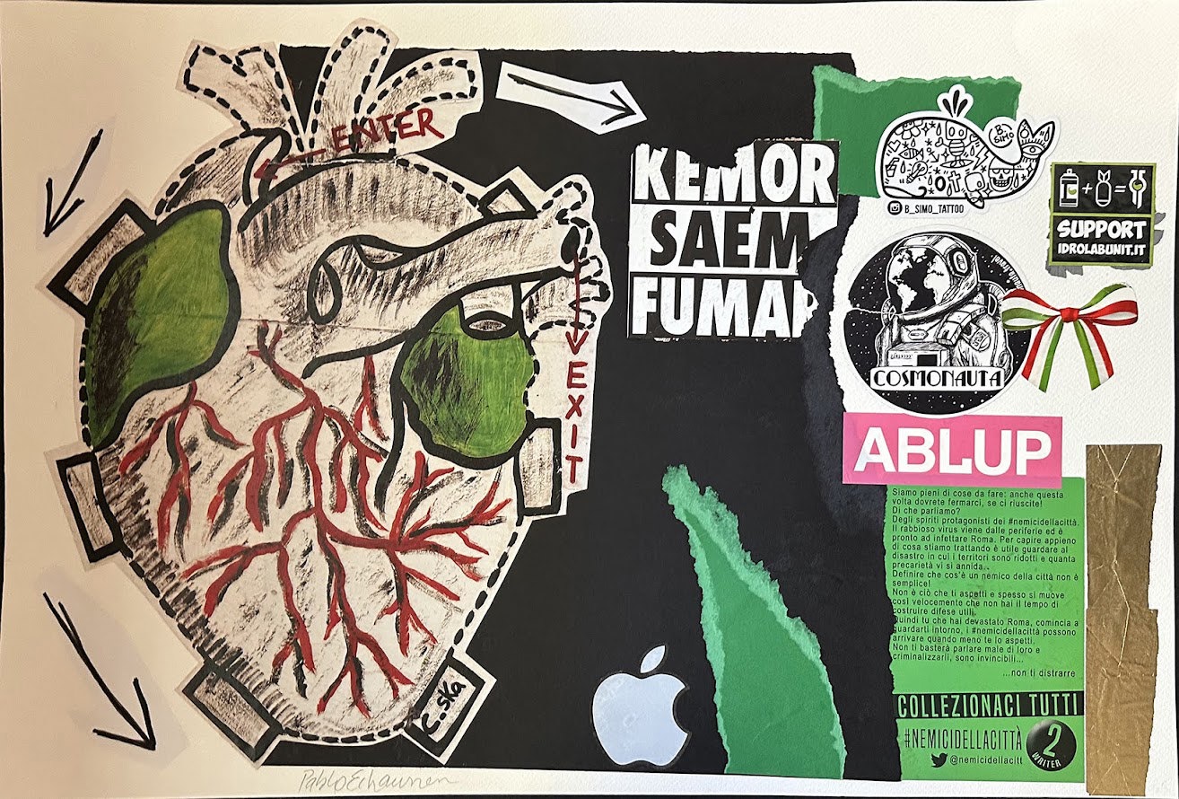 Collaboratore, da scrittore e disegnatore, di Lotta Continua e di varie fanzine antagoniste, figlio e fratello d’arte (di Roberto Sebastian Matta e di Gordon Matta-Clark, con il quale ha esposto nel 2013 alla Fondazione Querini Stampalia di Venezia), collezionista vorace di libri futuristi e di bassi, di cui da ragazzo voleva diventare suonatore, devoto a Duchamp e cultore dei calembour, da allora Echaurren non ha più smesso di dipingere e disegnare, esponendo in Italia e all’estero. Ora, dal 28 febbraio al 19 aprile, è protagonista alla Galleria dell’Incisione di Brescia della personale «Wall of Memories», curata da Raffaella Perna, in cui sono presentati 35 collage realizzati dagli anni ’60 a oggi. Una pratica da lui sempre coltivata, quella del collage, nel solco delle avanguardie del primo ‘900, e continuamente rielaborata in stratificazioni di tempo e di memoria, proprio come accade nell’opera che dà il titolo alla mostra. Personaggi dei fumetti, modelle bellissime, biglietti da un dollaro e insetti repellenti, chitarre basso e omaggi ai futuristi Boccioni e Sant’Elia, tutto si mischia nei suoi collage in un voluto disordine anarchico e rivoltoso. «Con l’atteggiamento sperimentale e la curiosità inesauribile del bricoleur, spiegano dalla galleria, Pablo Echaurren assembla elementi prelevati da fonti diverse, dall’imagerie populaire ai fumetti, dagli slogan degli ultras alla militanza politica, dai santini ai francobolli e alle tavole anatomiche»: tutti temi che testimoniano la sua ramificata curiosità intellettuale, che lo porta a esplorare i territori più disparati e che poi «precipita» in queste tavole cariche di energia.