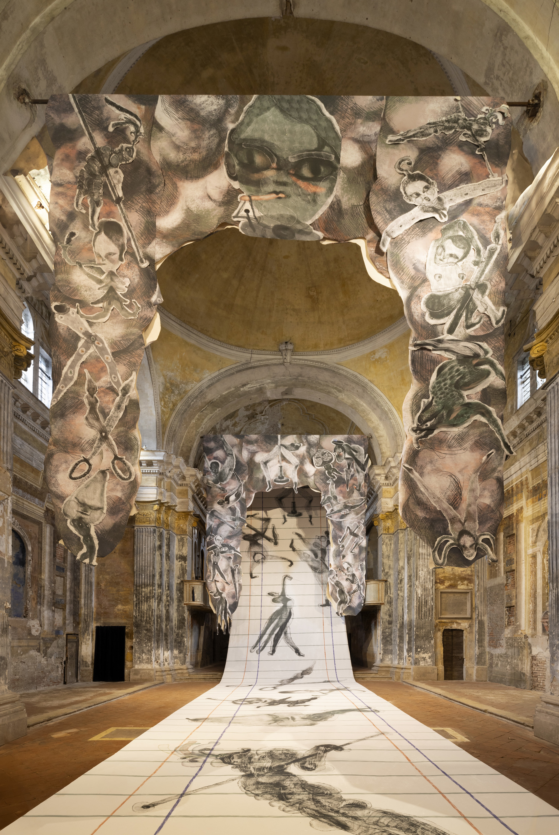 L’artista torinese ha anche composto una filastrocca che dà ritmo e senso all’installazione, un grande unico disegno su una tela di 1.500 metri che si impenna verso l’abside