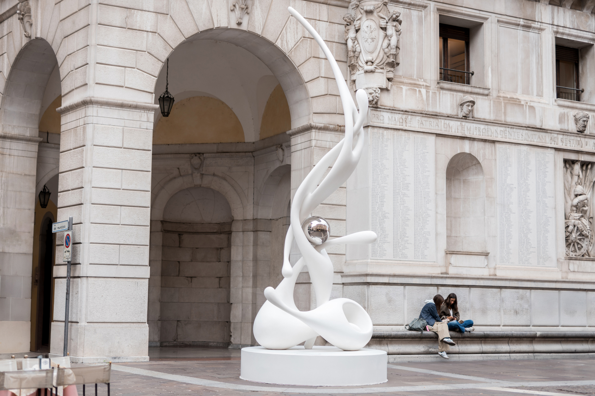 Colpisce molto il fatto che le quattordici opere siano distribuite in tutta la città, dalle periferie al centro storico. Questo consente a più persone di convivere con le opere, trovandole inserite in ambienti diversi. È una mostra fuori dalle mura del museo e della chiesa, all’aria aperta, visibile e accessibile a tutti. Le sculture diventano interventi sorprendenti nella vita frenetica della città e dei suoi abitanti. Hanno il potere di cambiare il modo in cui le persone vedono e vivono Padova – invitandole a riflettere sui suoi materiali, le architetture, i punti di vista abituali – e a lasciar volare l’immaginazione. Possono anche indurre a pensare in modo diverso rispetto al tempo: non solo al passato in relazione al presente, ma anche al momento fugace, rallentando o accelerando la nostra percezione mentre sostiamo davanti alle opere. Una delle sculture, «Shell Sphere», collocata sul percorso che conduce alla Cappella degli Scrovegni, può essere toccata e ruotata a mano, portando lo spettatore direttamente nella sua orbita. È realizzata in bronzo lucidato e patinato, e cattura la luce in modi affascinanti durante la rotazione. Le sculture di Meggiato uniscono la scala umana alla suggestione di forze e spazi che la trascendono. Si innalzano verso l’alto con un’energia verticale e ascendente. Spesso evocano speranza e aspirazione, ma anche un movimento di crescita spiraliforme. Queste idee si adattano perfettamente a Padova – in sintonia con la sua storia culturale e, al tempo stesso, come risposta alla sua gravità storica. Le sculture di Meggiato portano luminosità e leggerezza alla materia pietrosa e antica della città.