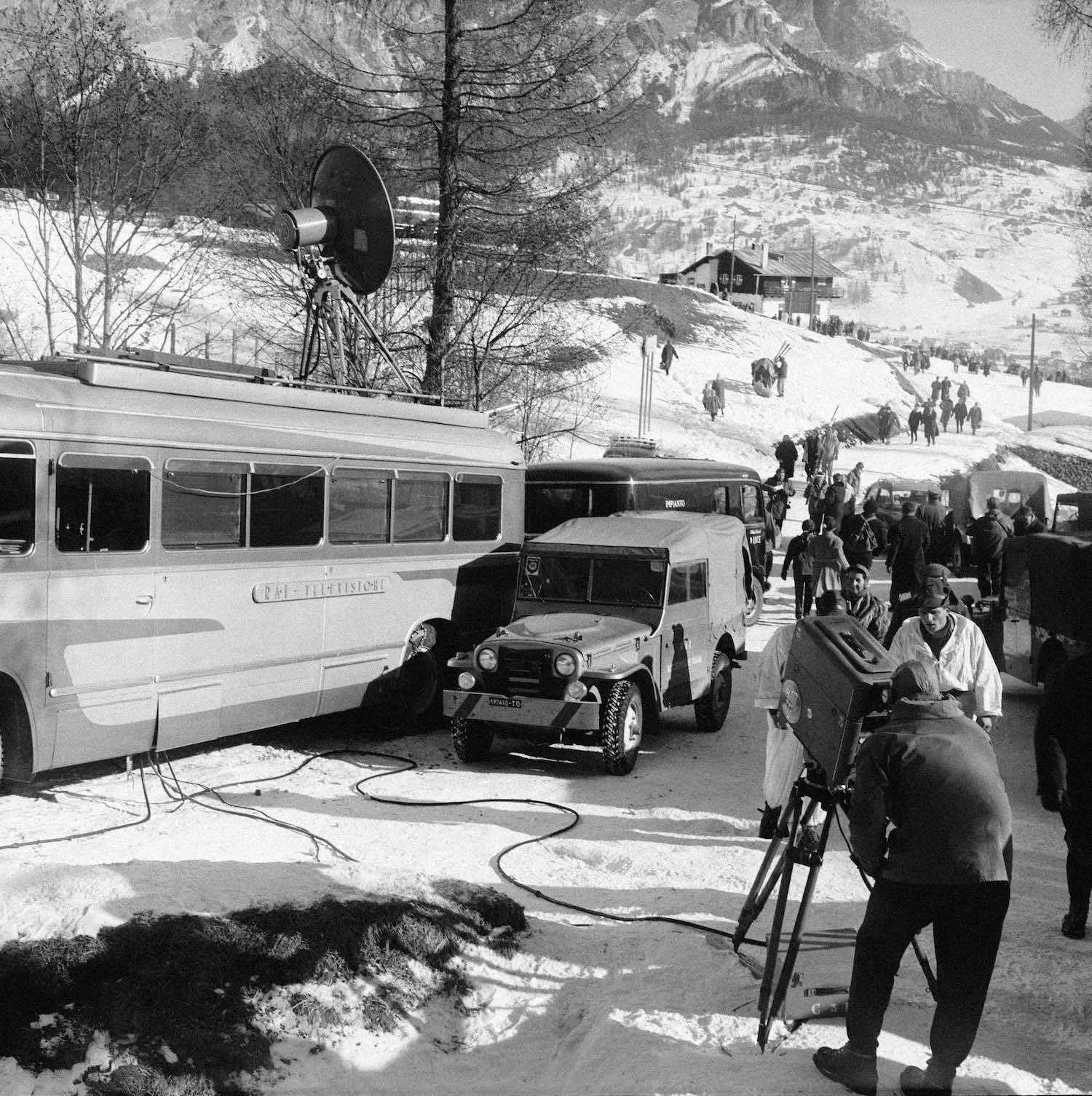 Mezzi e attrezzatura Rai per le riprese dei VII Giochi Olimpici Invernali TM, 3 febbraio 1956. Fotografia di Publifoto. Archivio Publifoto Intesa Sanpaolo