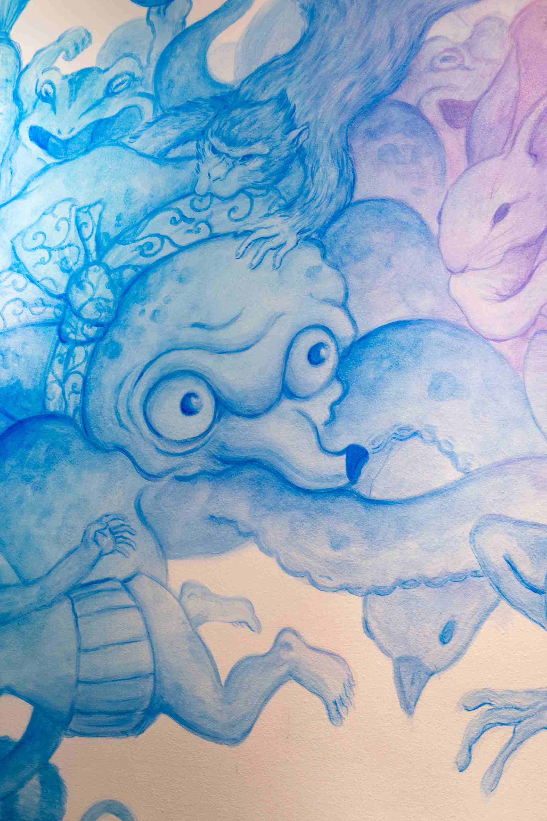 Formatosi nell’ambito dell’Urban Art e attivo a livello internazionale, El Gato Chimney (all’anagrafe Marco Campori, classe 1981) ha sviluppato un linguaggio che unisce studio del simbolo, immaginario rituale e una minuziosa attenzione al dettaglio. Le sue opere presentano creature che appartengono a un mondo parallelo, sospeso tra osservazione della realtà e trasfigurazione fantastica. Sulle pareti di Zazà Ramen, il wall painting Emakimono Colors prende forma come una lunga sequenza di figure in metamorfosi: animali, presenze fantastiche, spiriti ibridi che sembrano procedere in una sorta di corteo teatrale. La composizione, ricca di ritmo e dettagli (non mancano le citazioni al ramen e alle bottiglie di sakè serviti ai tavoli), costruisce un’idea di collettività in cui ogni presenza, reale o inventata, partecipa a un’unica scena condivisa.