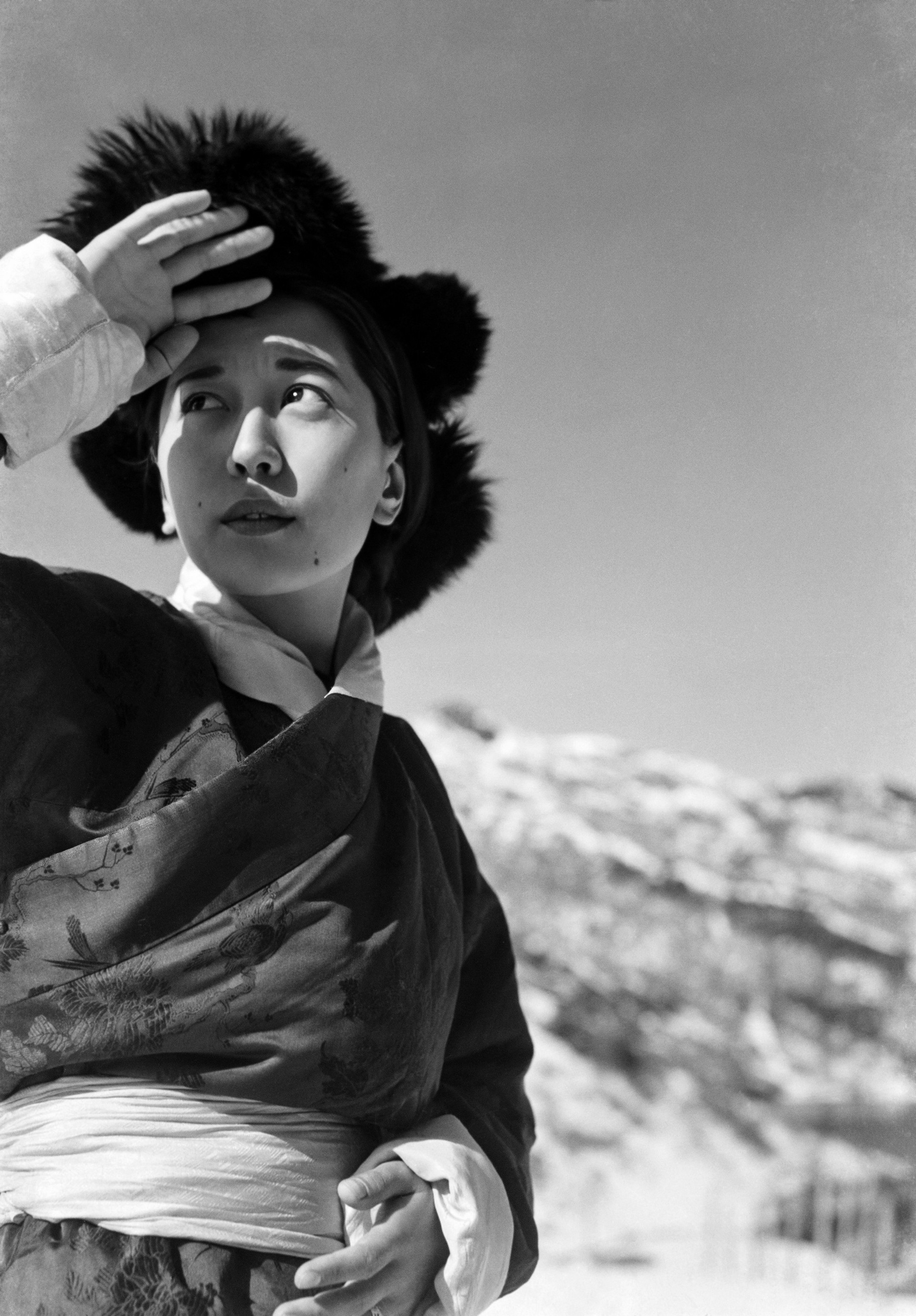 La principessa del Sikkim (india) nei pressi del Passo Nathu La, al confine tra India e Cina, a 4.310 m di altitudine, in una foto di Fosco Maraini del 1948. © Foto: Fosco Maraini / Proprietà Gabinetto Vieusseux. © 2024 Archivi Alinari