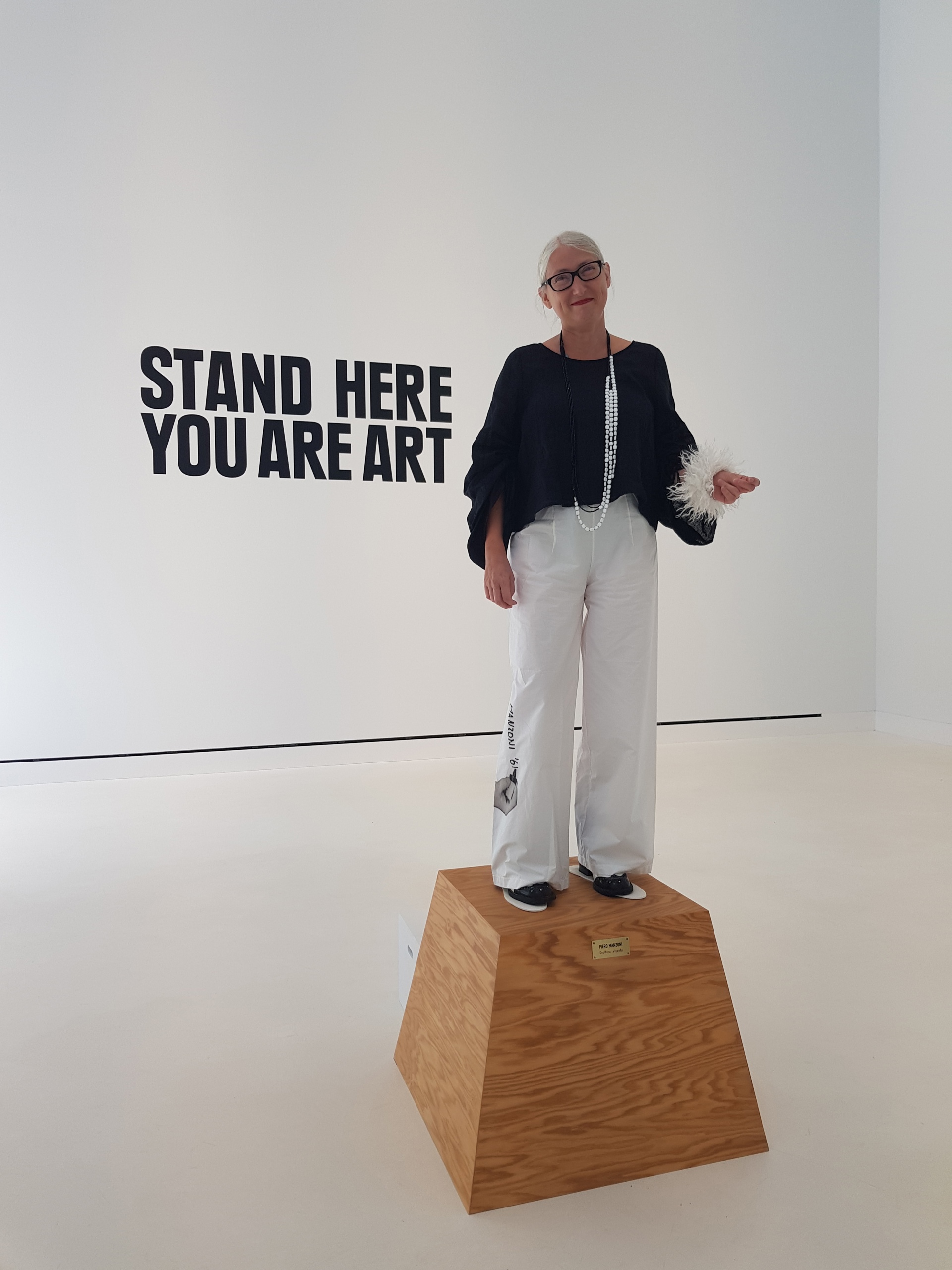 Rosalia Pasqualino di Marineo su una copia della «Base magica» alla mostra «Piero Manzoni: Total Space», presso Magazzino Italian Art, Cold Spring (fino al 23 marzo 2026)