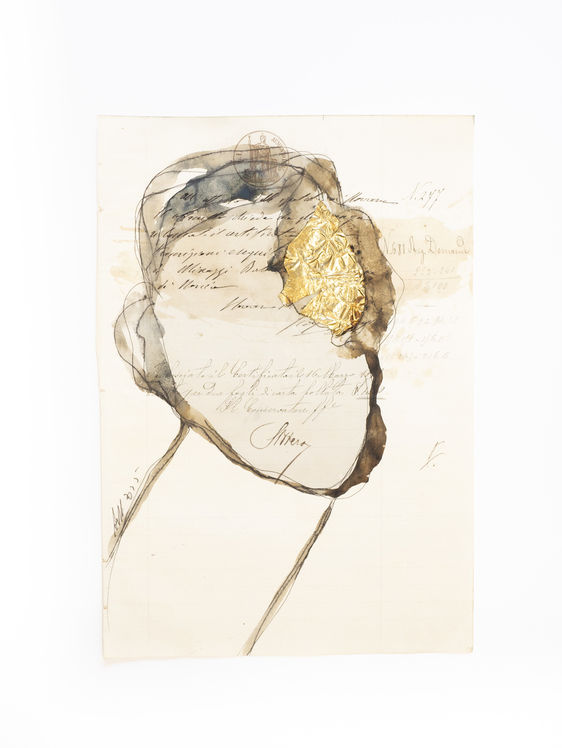 Antonio Marras, inchiostro, matita, foglie d’oro e acquerello su carta