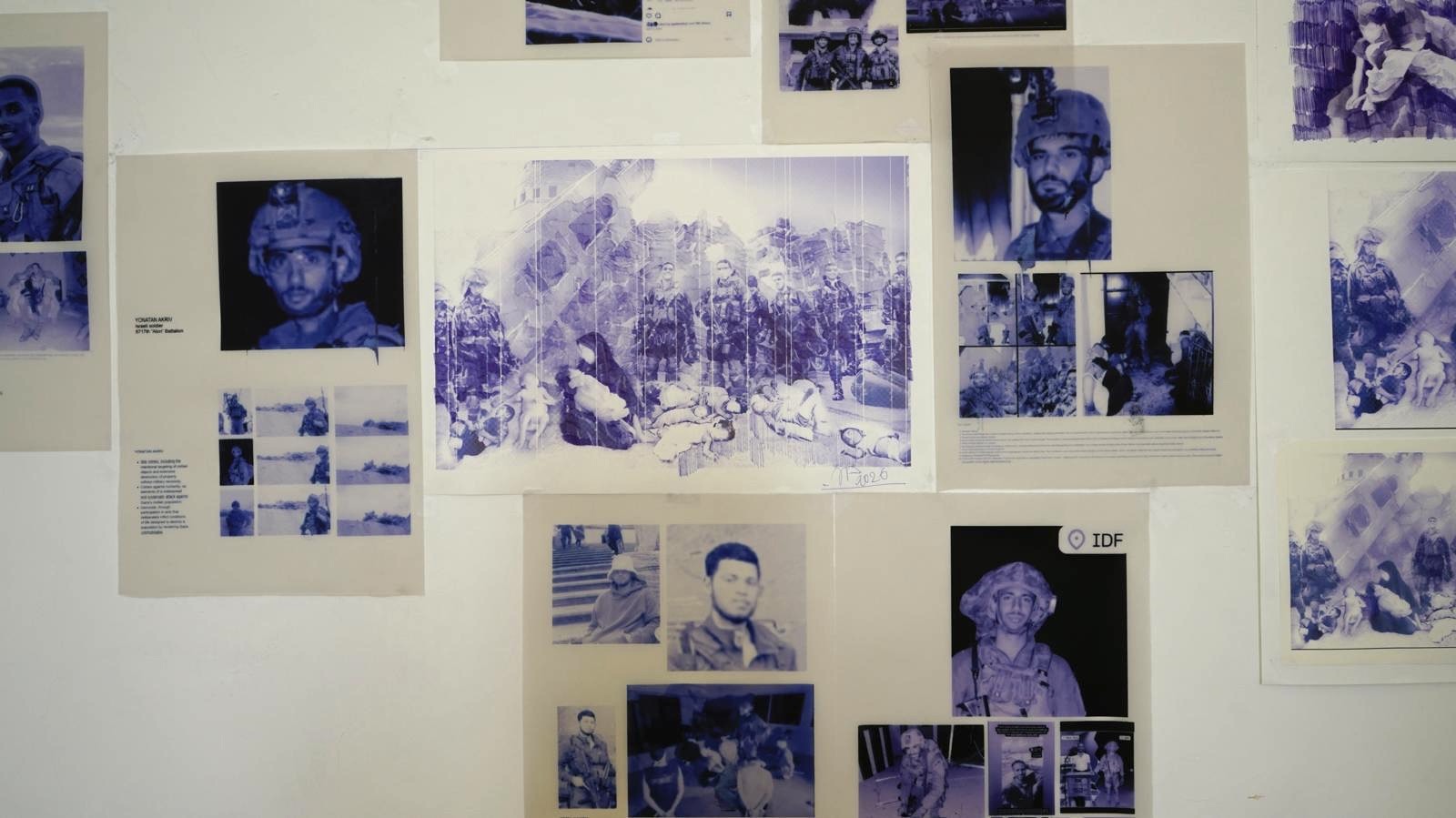 La durezza e la drammaticità dei nostri tempi impongono all’artista russo un cambiamento linguistico, per meglio relazionarsi con la contemporaneità. Insieme all’uso quasi ossessivo della biro di colore blu, che in questo caso costituisce la cifra stilistica. Ecco che brandelli cianotici di realtà restituiscono il male che non conosce soluzione di continuità. Un male che viene analizzato e restituito impietosamente, con la precisione dei metodi di investigazione propri dell’Fbi e della Cia. La possibilità di identificare gli autori degli orrori, perpetrati quotidianamente ai danni della popolazione palestinese, consente all’artista di dare un volto e un nome a quei criminali. Il dittico «The massacre of the innocents» non costituisce solo un atto di accusa nei confronti dei responsabili di quegli orrori - di cui sono indicati nomi, cognomi, nazionalità e corpo militare di appartenenza - ma è anche un memorial dedicato alle vittime, identificate con i loro nominativi, la nazionalità, l’età anagrafica e l’indicazione «dispersi» o «uccisi». In continuità con la tradizione sovietica, per la quale è importante preservare la memoria delle vittime di repressioni. Le due grandi tele sono quasi identiche, a differenziarle è la tonalità di blu della biro: una più chiara, l’altra dal tratto più fitto e scuro, nel segno dell’approssimarsi di quell’abisso propiziato dall’«eternal darkness», dal nome dell’operazione militare lanciata dall’IDF contro il Libano.