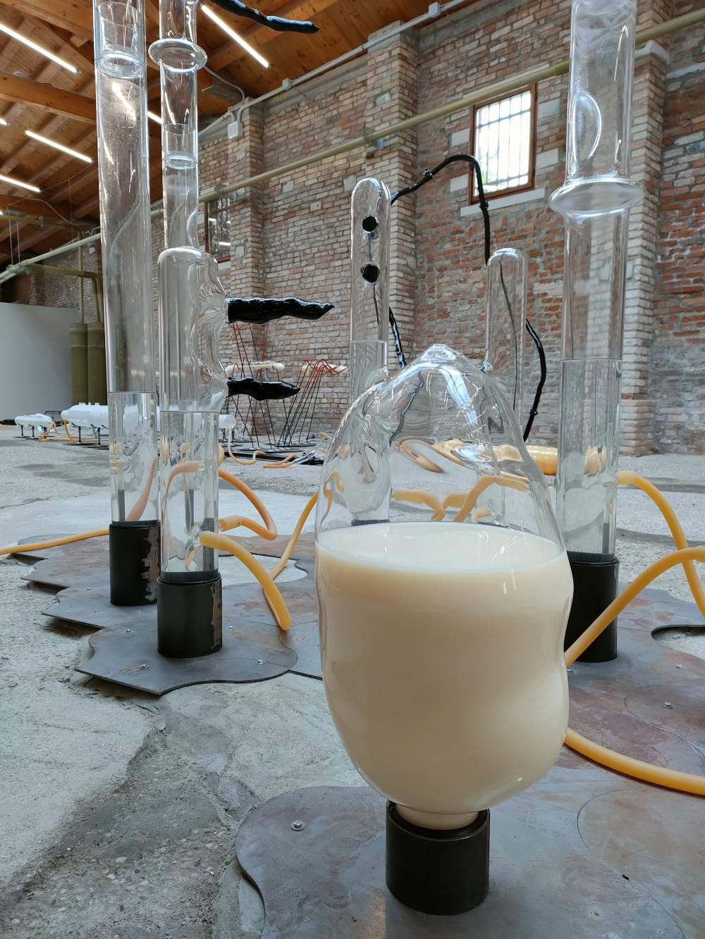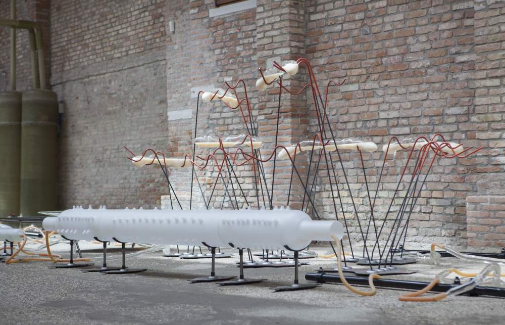 «Il sistema funziona con una pompa e approfittando anche dell’inerzia della gravità fa circolare l’acqua negli organismi che abitano nel padiglione, poi torna alla laguna» spiega Fluxà. A differenza degli antichi alchimisti che volevano nobilitare materiali umili, l’artista non intende trasformare nulla, anche se le sculture lasciano comunque passare l’ossigeno sufficiente a provocare cambiamenti imprevisti nei sedimenti che l’acqua depositerà nei 7 mesi della Biennale.
