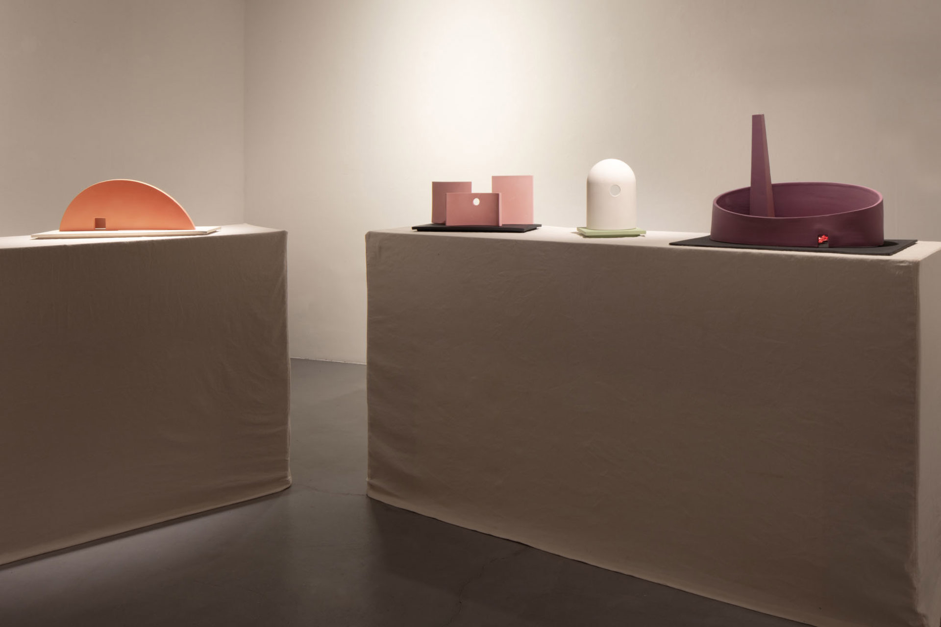 Nella mostra ci si imbatte così nel recinto ovale, violetto, di una minuscola manifattura ceramica, con l’altissima ciminiera, la casetta (minima e dorata) del guardiano e un’aiuola abitata da rose rosa, modellate a migliaia dalle donne locali e già pronte all’uso per chiunque le voglia utilizzare. O in «paesaggi» più essenziali, uno dei quali è una sorta di poetica pagoda color salmone, l’altro un piccolo edificio giallo dalla pianta a mandorla che, come tutti questi «paesaggi», può ospitare una candela, la cui luce uscirà qui dal foro sul tetto. In un altro, invece, la luce è irradiata dagli spazi che si aprono tra tre lastrine piatte e curve di un tenero rosa, in un altro ancora dalla finestrella di una casa essenziale di un pallido verde. Ma poiché la poesia non si può raccontare, l’invito è di vedere di persona questi piccoli mondi fatati, che qui sono accompagnati dagli altrettanto poetici disegni di ognuna delle sculture esposte.