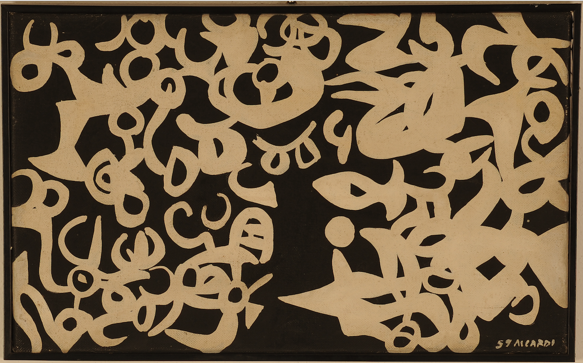 La raccolta prende forma come una narrazione continua che attraversa stagioni cruciali dell’arte del Novecento. Dagli anni Trenta emergono le tensioni tra astrazione lirica e costruzione geometrica, con artisti come Osvaldo Licini, Atanasio Soldati e Manlio Rho, in un clima in cui la forma cerca ancora un equilibrio possibile. È un’arte che lavora sulla soglia tra ordine e immaginazione, e che nella collezione Riccardi diventa già dichiarazione di metodo: scegliere non per appartenenza ma per necessità interna dell’opera. Con gli anni Cinquanta il linguaggio si apre e si frantuma. La pittura diventa campo di energia e materia, attraversata da gesti che non rappresentano più ma agiscono. Entrano in scena figure come Alberto Burri, Giulio Turcato e Franz Kline, in un dialogo che mette al centro il segno come traccia fisica e mentale. Qui la collezione si struttura come un atlante del cambiamento, dove ogni opera sembra registrare un passaggio di stato della pittura stessa.
