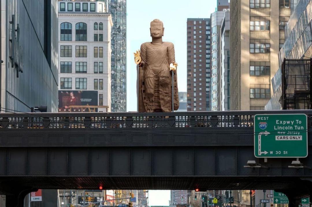 Collocata sopra la 10th Avenue, la figura reimmaginata si presenta come una presenza sospesa tra perdita e continuità