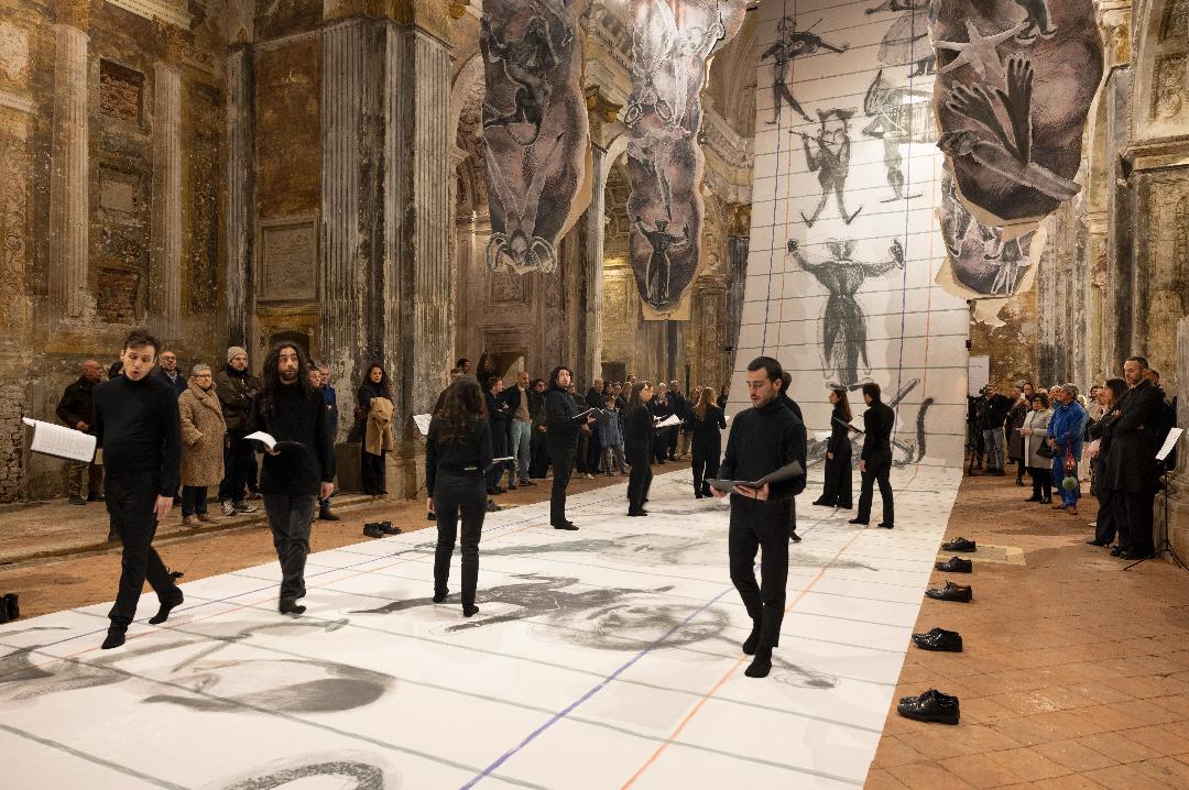 L’artista torinese ha anche composto una filastrocca che dà ritmo e senso all’installazione, un grande unico disegno su una tela di 1.500 metri che si impenna verso l’abside