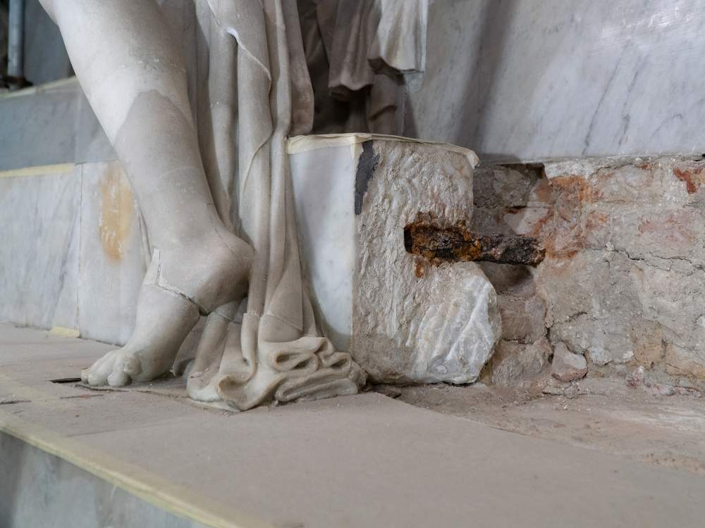 Bisognava poi risolvere un mistero: perché di tanto in tanto alcune delle statue cominciavano a sudare. Inizialmente il fenomeno è stato attribuito alla saturazione del sottosuolo causata dalle inondazioni, fino a quando non si sono scoperti i veri colpevoli: due tubature ostruite che avrebbero dovuto convogliare l’acqua piovana dalle grondaie ai «gatoli» che sboccano nel canale e che, invece, sversavano acqua nella muratura in mattoni della chiesa. È stata una scoperta empirica da parte di Giannelli, che ha notato nel 2021-22 che le statue continuavano a sudare quando scoppiavano tremendi temporali, nonostante le barriere mobili tenessero l’acqua alta lontana da Venezia. Da quando sono state riparate dal Comune, le statue non sudano più.