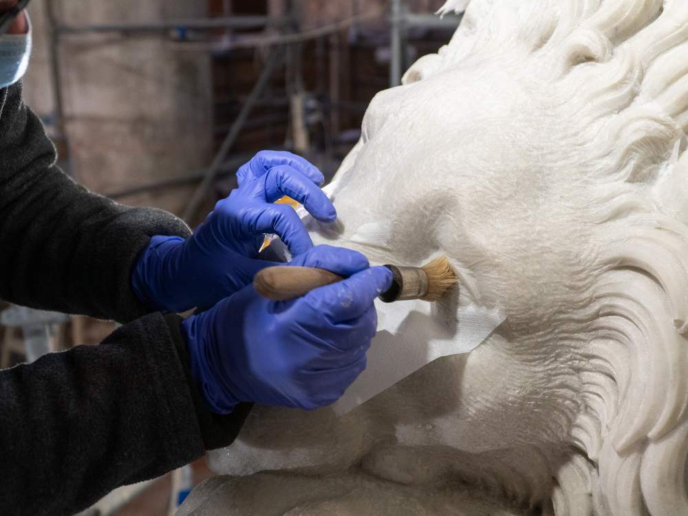Un momento del restauro del Monumento di Canova. Foto Joan Porcel